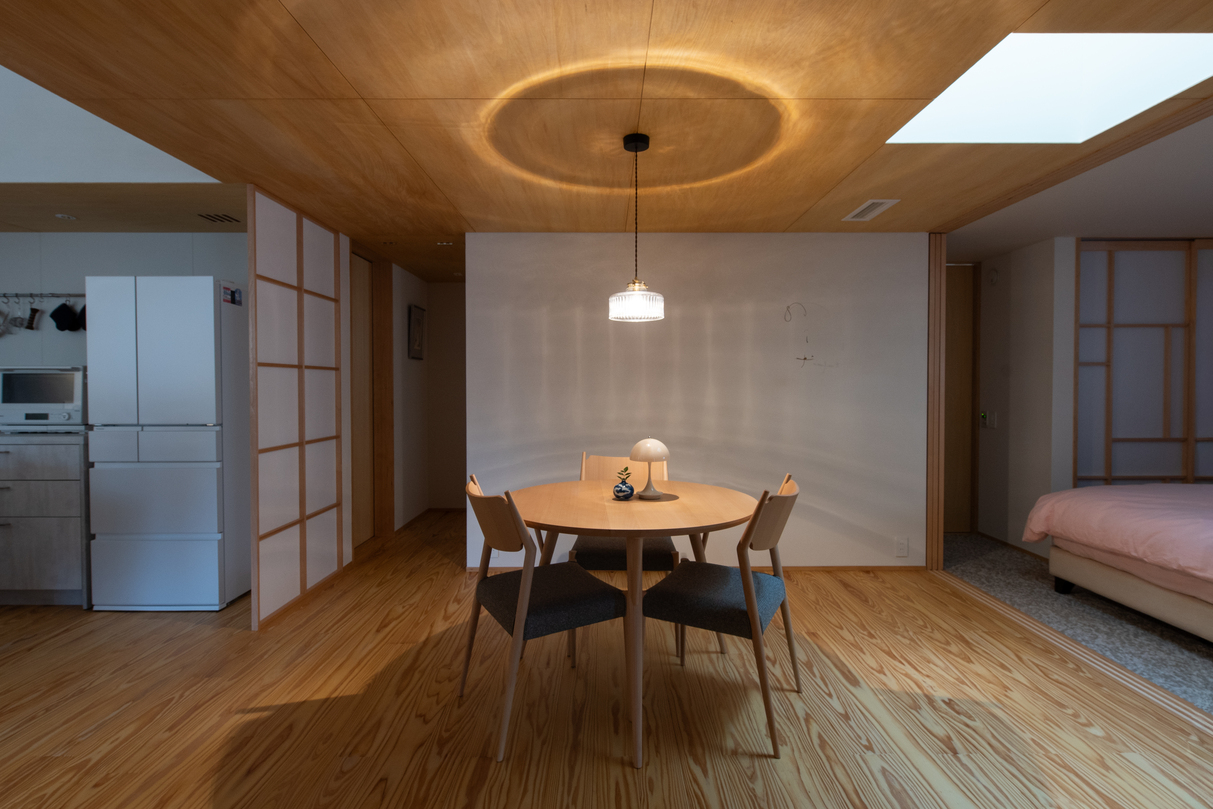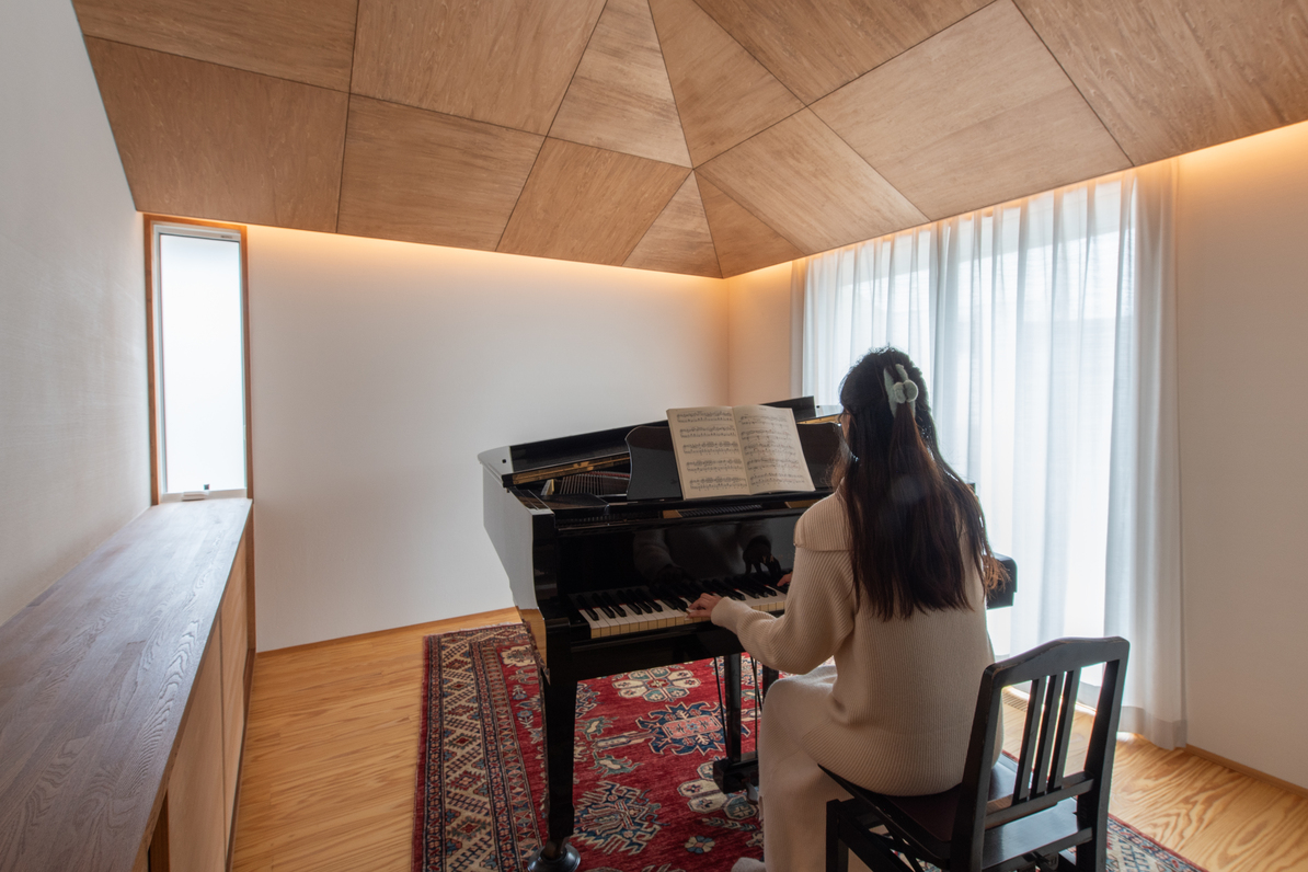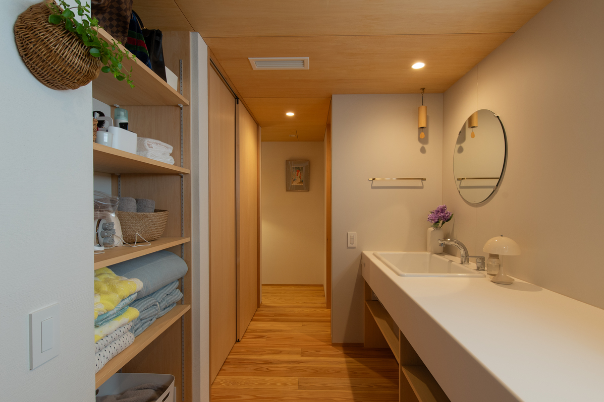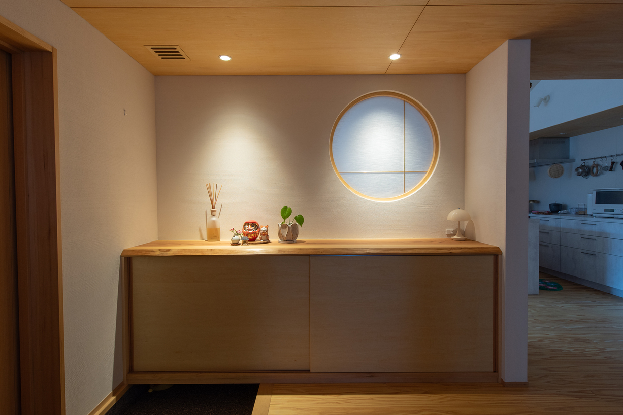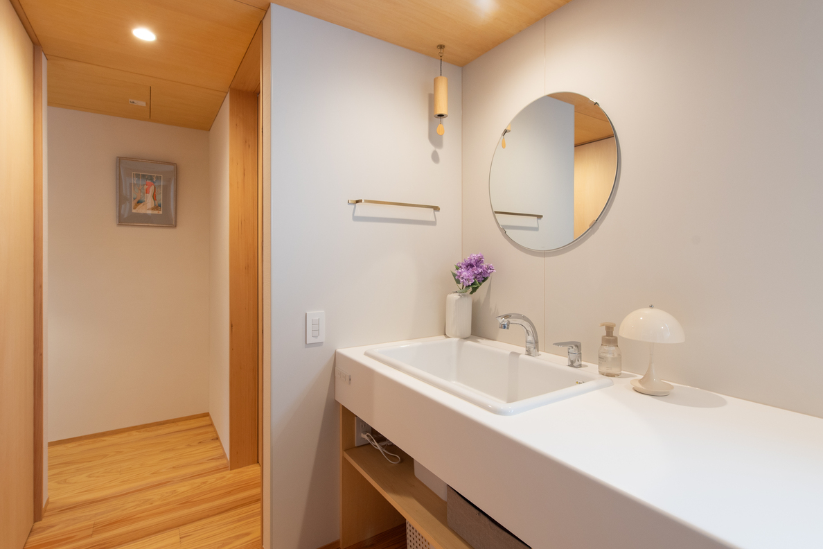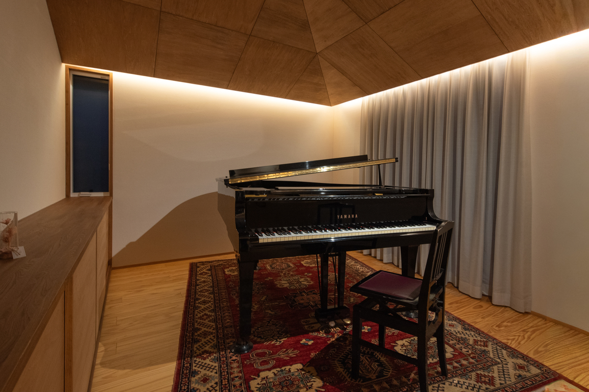 和と洋、その境界に静かに芯を置く。どこか懐かしく、それでいて今の暮らしに自然と馴染む空間。各居室には、それぞれ異なる表情と空気感を持たせ、住まいの中に緩やかな居場所の違いをつくり出した。ひとつの住宅でありながら、場面ごとに気配が変わる。美しさが日常の中に静かに息づく住まい。