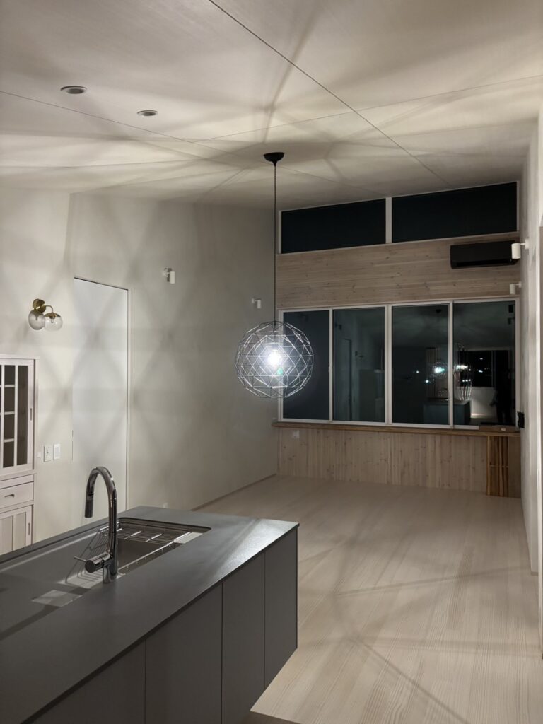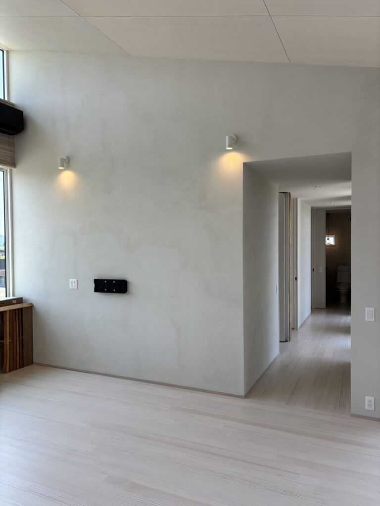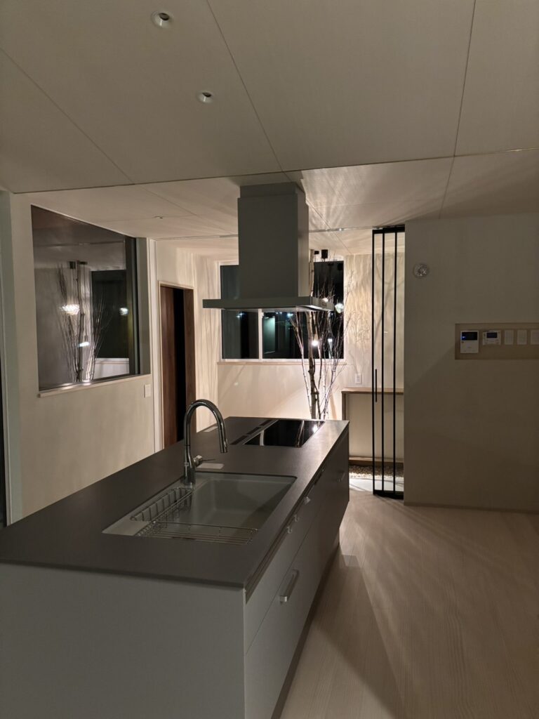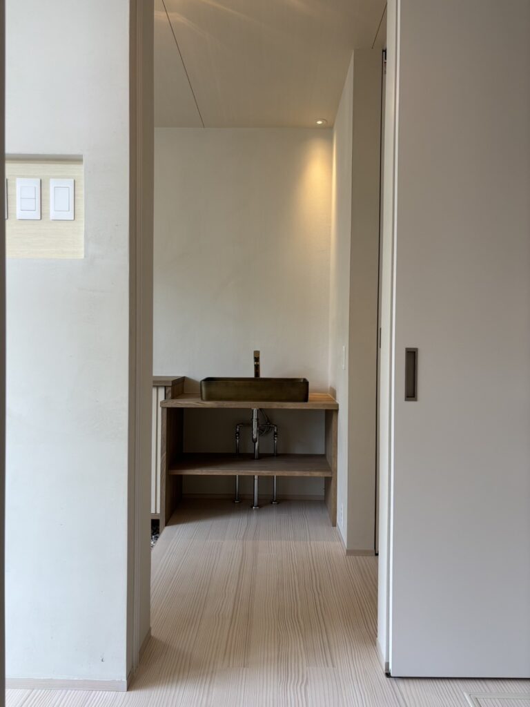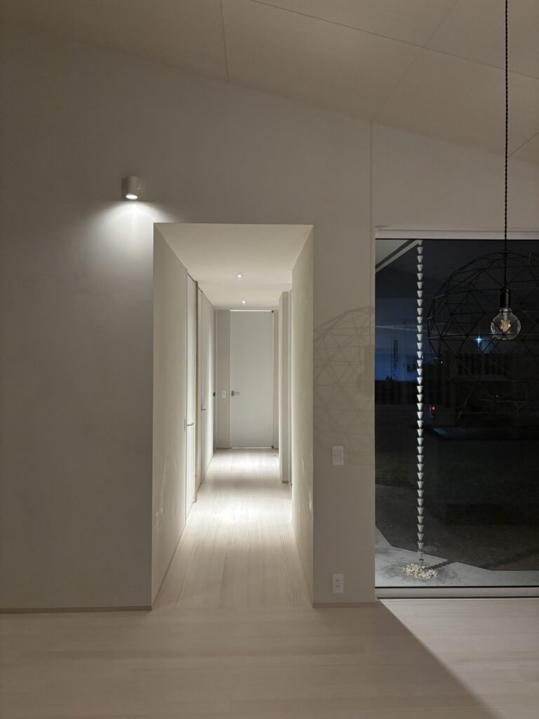 光と影、素材の質感、視線の抜けがゆるやかにつながり、日常の中に小さな余白と安らぎをつくる住まい。