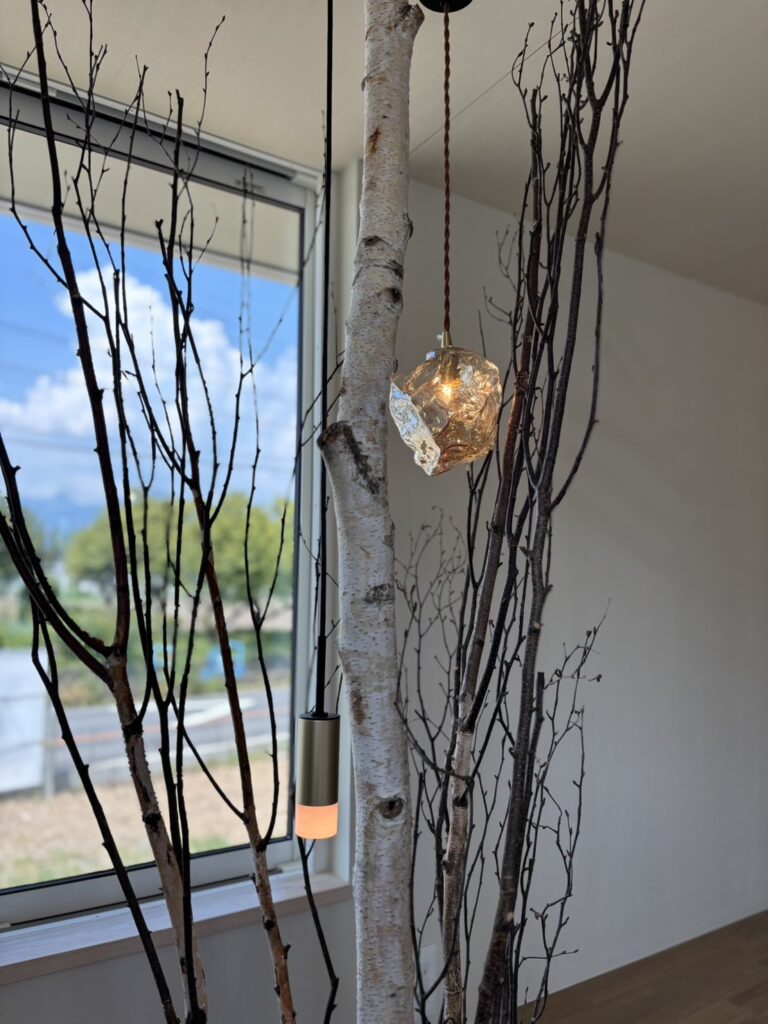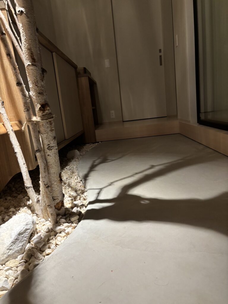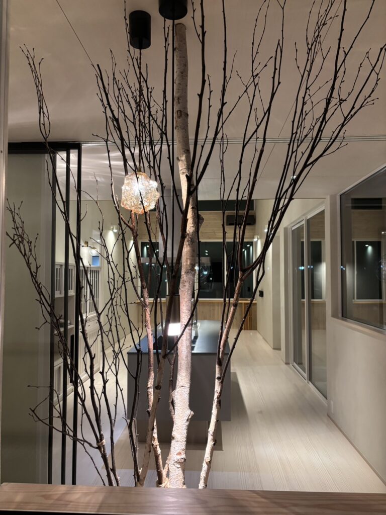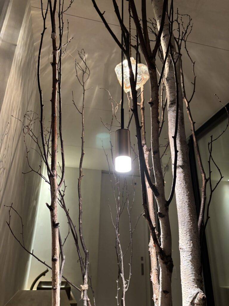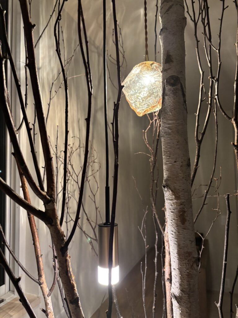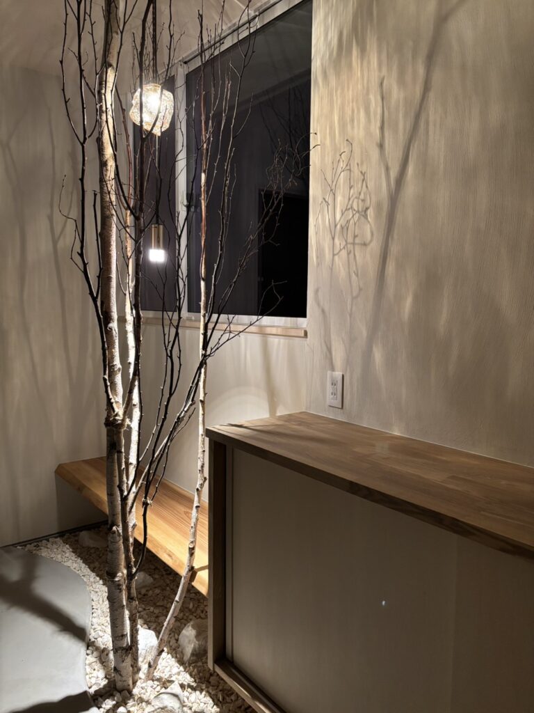 白を基調とした静かな空間に、枝のシルエットとやわらかな灯りが重なり、室内でありながら、どこか森の中に身を置くような感覚を生み出している。