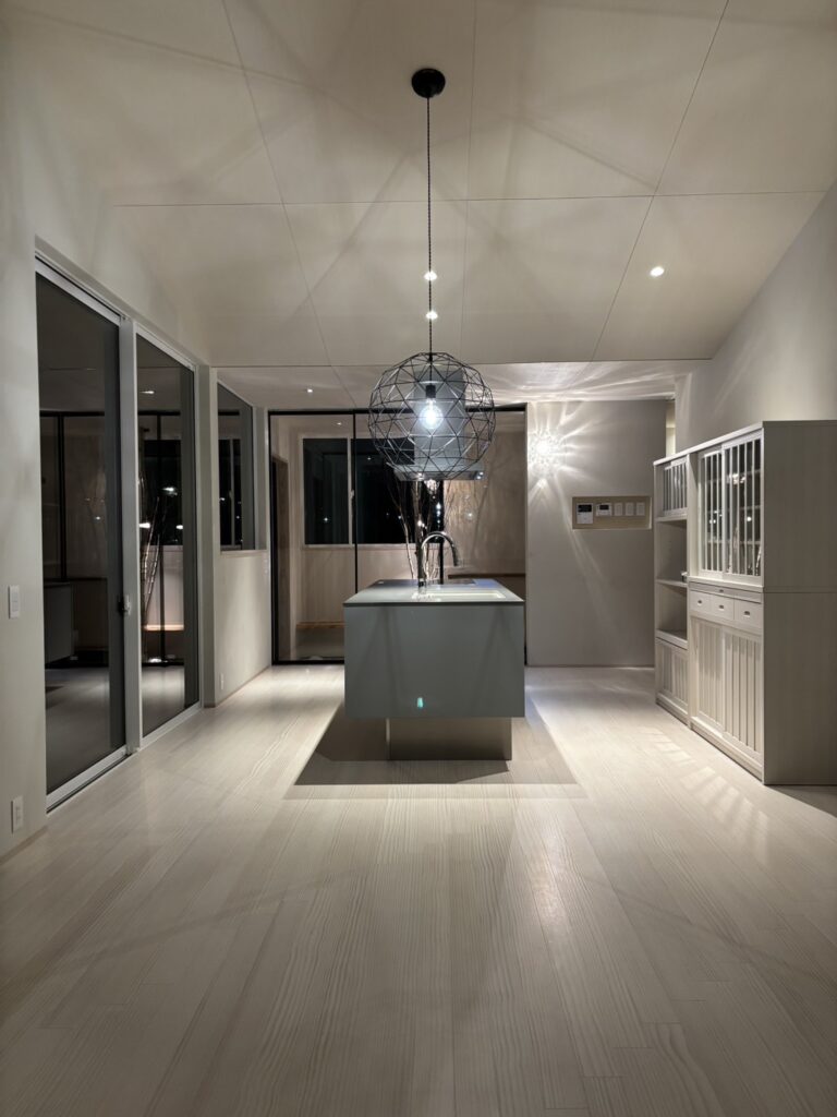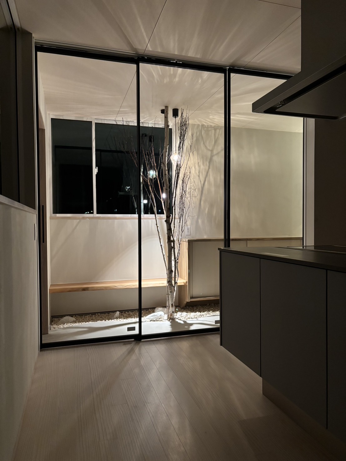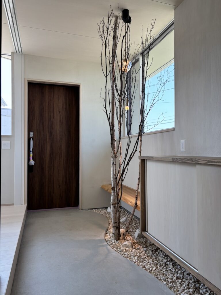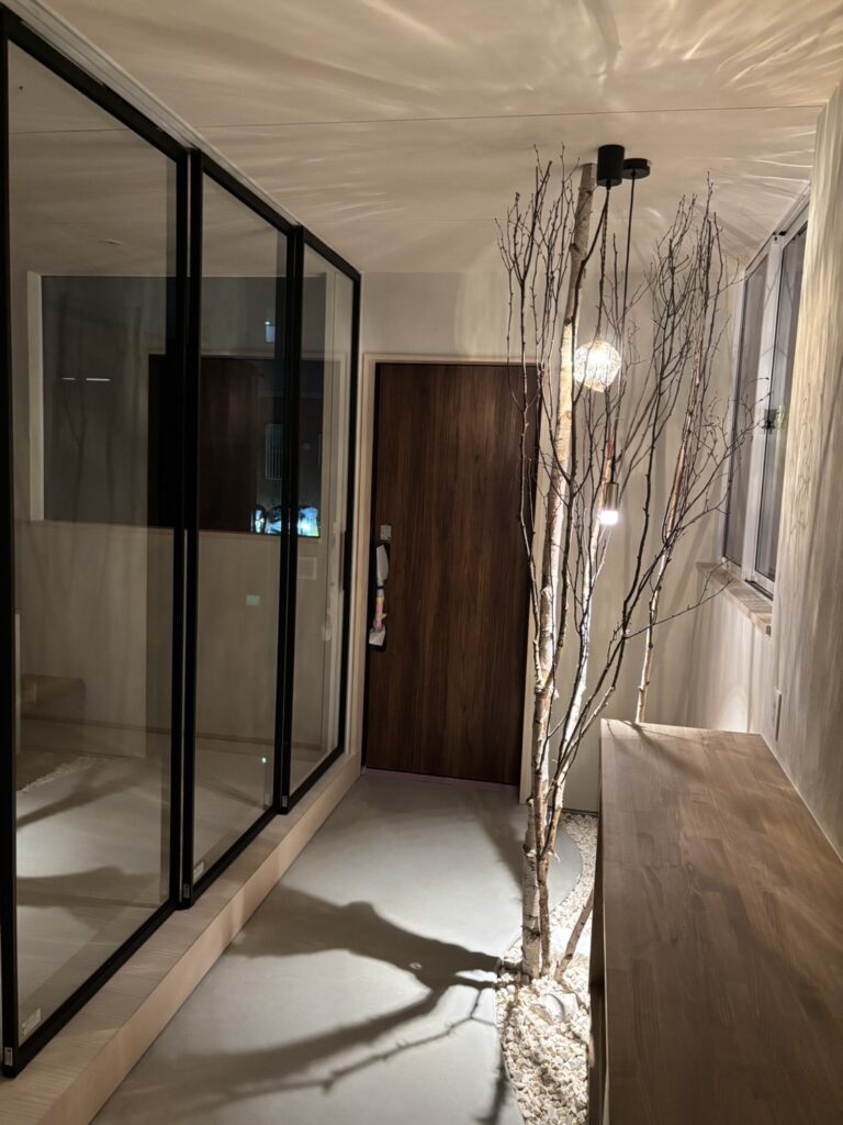 白を基調とした静かな空間に、枝のシルエットとやわらかな灯りが重なり、室内でありながら、どこか森の中に身を置くような感覚を生み出している。