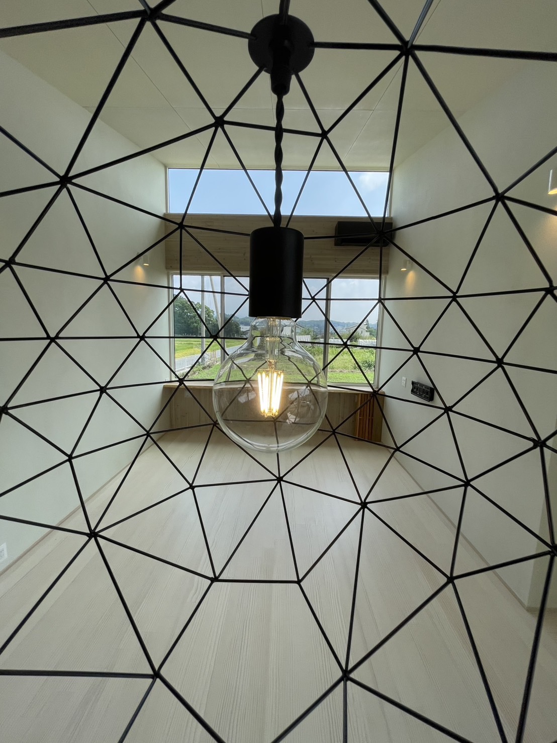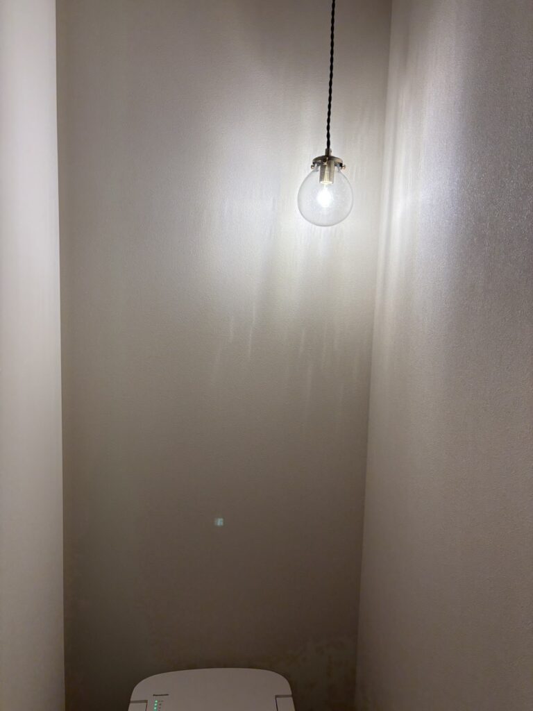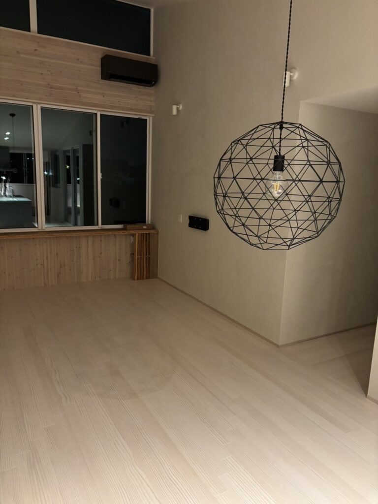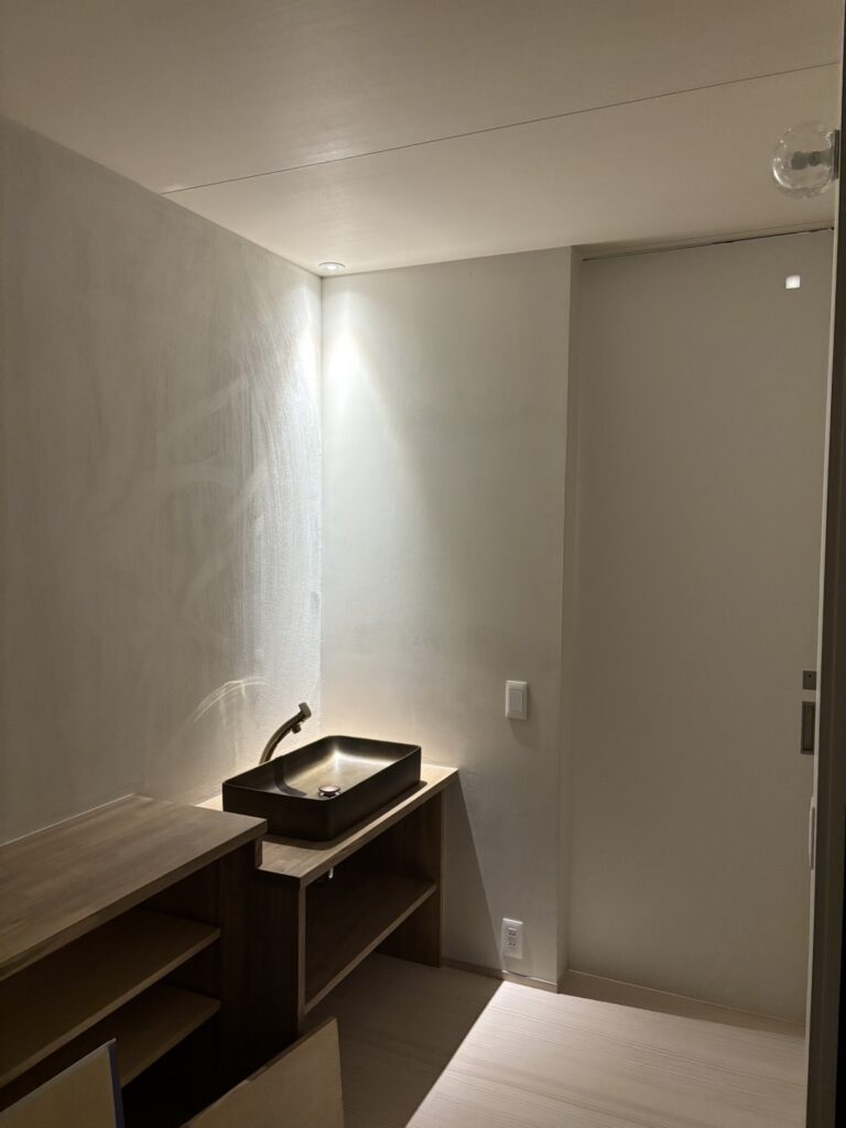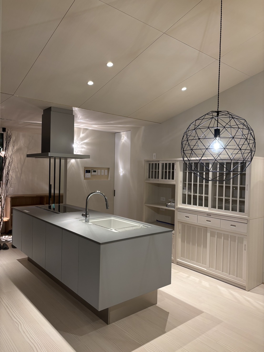 白を基調とした静かな空間に、枝のシルエットとやわらかな灯りが重なり、室内でありながら、どこか森の中に身を置くような感覚を生み出している。
